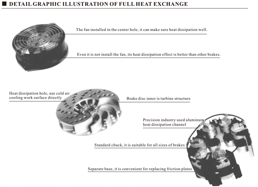 The primary function of brakes is the conversion of mechanical energy into heat, which is then dissipated into the atmosphere. The amount of heat which can be dissipated by air cooled Disc Brakes are dependent on a high rotational speed, large disc diameter, and large radiant surface. With the addition of an electric fan fitted to the center of the housing, the best possible thermal power dissipation was achieved without high dependency on speed, and avoiding the need to increase the disc diameter in continuous slipping applications Suitable for high heat dissipation.
