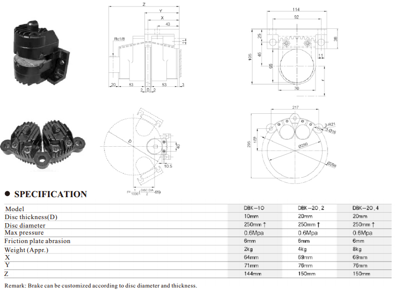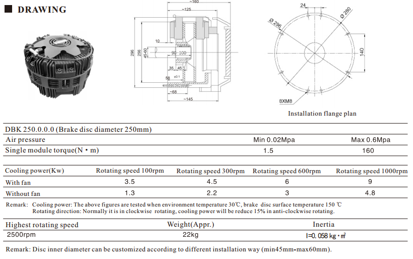 DBK model air caliper disc brake is composed of lining, piston, air chamber, fan cover, braking disc, fixed bolt, fixed frame and so on. This brake relies on air pressure to brake, return springs to release. After supplying air pressure, piston pushes friction plate moved towards to and compressed braking disc, producing resisting torque, until disc and other rotating parts stopped, brake linked. When exhausting air pressure, piston and friction plate back and separated with braking disc by return springs, brake released. Its response is sensitive, torque control precise. Piston sealing part is without oil. Lining thickness is 10mm, max abrasion 6mm. When lining abrasion reached to 6mm, using screwdriver to take out head inside screw through hole of disc with hub to replace lining. Our group air caliper disc brake DBK can replace RE made CX250 completely with high quality, ecomonic price and good after-sales service.