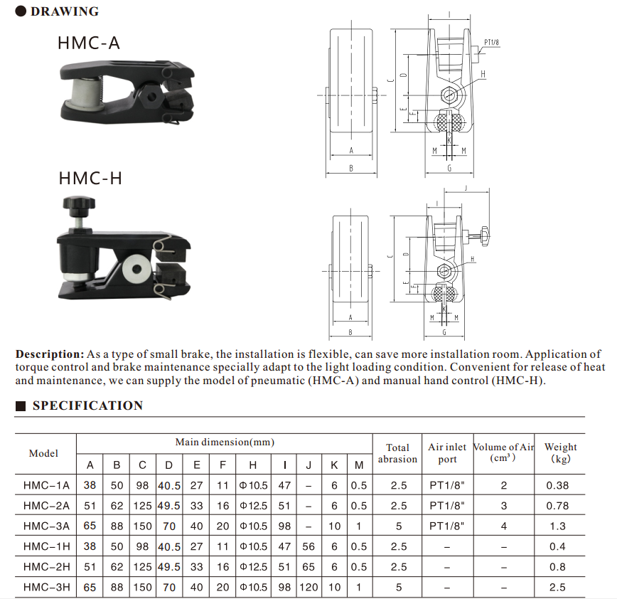 As a type of small brake, the installation is flexible, can save more installation room. Application of torque control and brake maintenance specially adapt to the light loading condition. Convenient for release of heat and maintenance, we can supply the model of pneumatic (HMC-A/DBZ-A) and manual hand control (HMC-H/DBZ-M).