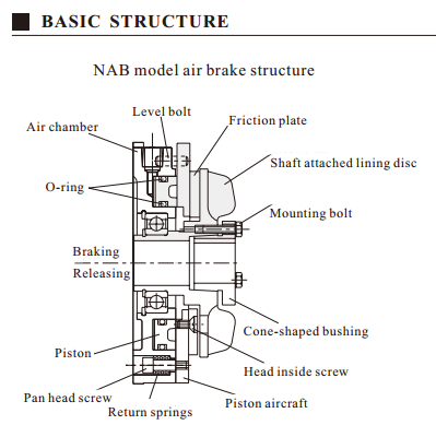 NAB model brake relies on air pressure to brake, return springs to release. After supplying air pressure, piston pushes piston aircraft and friction plate move towards to and compressed shaft attached lining disc, disc and other rotating parts stopped, brake braked. After exhausting air pressure, piston aircraft and friction plate are separated with shaft attached lining disc by return springs, brake released. It reduced heat generated from friction by cooling plate mounted on disc with hub. Friction plate is two-cut style, using screwdriver to take out head inside screw through hole of disc with hub, in order to replace friction plate.