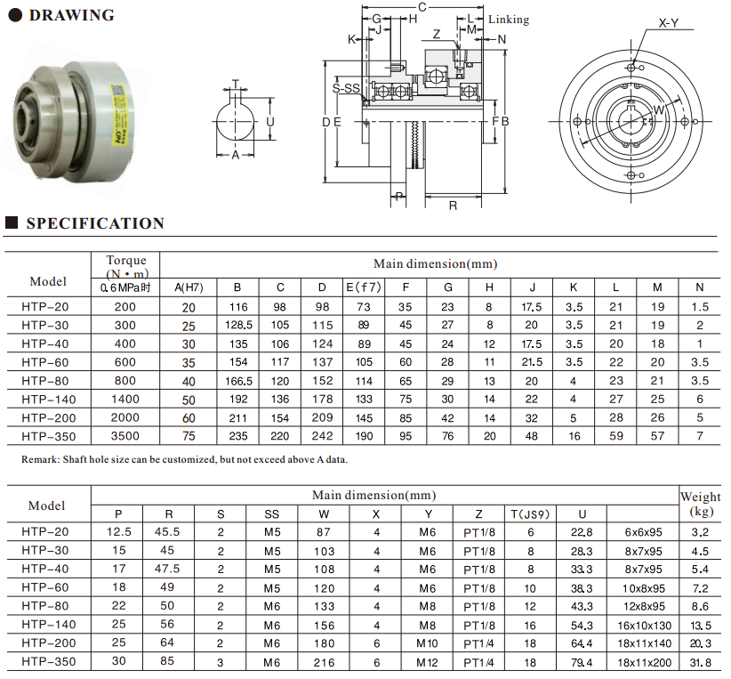 It is a kind of tooth clutch, can transmit high torque. This model pneumatic clutch can well replace CTHP model pneumatic tooth clutch used in tire shaping machine, medical appliances, food machine, printing press, crusher, etc. to connect the power and driven part. This clutch is linked with air pressure, released by return springs. After supplying air pressure, piston pushes driving tooth plate to slide along the direction of the axis, driving tooth plate compressed driven tooth plate to come into an integrated structure, clutch linked. Driving tooth plate and driven tooth plate are separated by return springs after exhausting air pressure, clutch released.