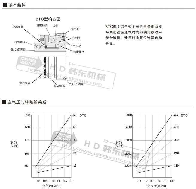 1. BTC型(齿合式)离合器是由两枚平面齿盘在通气时 内部轴向移动来齿合连接,泄压时由复位弹簧自动分离