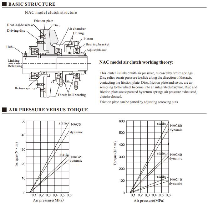 NAC pneumatic-coaxial shaft clutch is standard model air shaft clutch. It used to transmit the torque from driving part to driven part via air pressure. Air pressure as power source is safe and economic for you. Following is the technical data of our NAC pneumatic shaft clutch for your reference: ![]() This NAC model air shaft friction plate clutch can replace Korea HAC HDC air clutch, ASAHI CSCP,CSMP model friction disc clutch,Steki and NEXEN pneumatic air shaft clutch well. This air shaft clutch is widely used in rubber machine rollers, conveyor, elevator, handling machinery, food machinery, printing machinery, crusher, motor, tire and rubber machinery, packaging machinery, forming machinery, automatic machinery, wire machinery, sheet metal machinery, filling machinery, plywood machinery, medical machinery, stretching wire machinery, fiber machinery, metalworking machinery, pulverizing machinery, tire forming machinery, paper making machinery and etc. ![]() |