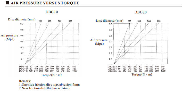 DBG model air caliper disc brake through adjust air pressure, so as to adjust torque in a wide range, it is suitable for emergency brake and tension control. Using manual brake, pressure springs will keep long time braking without air pressure. Random adjustment springs quantity to adjust torque, it is from 2N.m to 36500N.m.