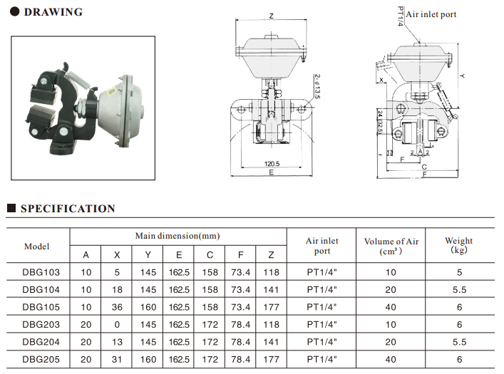 Economic air caliper disc brake offers stable, effective and adjustable braking force. Vertical type installation, save space, open-type friction plate good for heat dissipation. Two-cut lining is easy for exchange, not contains asbestos, braking disc thickness 10-20mm available. Waterproof, dust-proof and heat resistance, can be frequent usage, function stable. Use air pressure as action resource, no electric spark, explosion-proof, safe and reliable. Braking force is adjustable, braking torque range is wide. Good dissipation, lining is wearable, two-cut type is easy for exchange. Regular brake model: DBG-103/104/105 DBG-203/204/205.