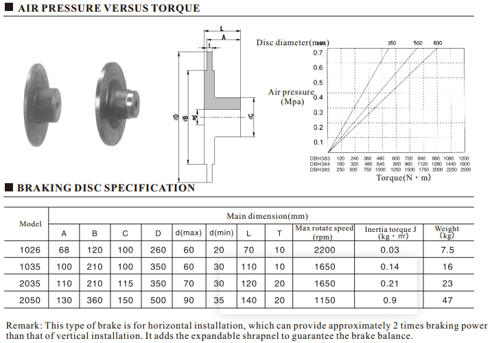 This horizontal air caliper disc brake torque is nearly twice of vertical type brake’s. Match with extension-type springs, can make sure braking balance. Braking disc thickness 10mm-20mm-38mm is available. Waterproof, dust-proof and heat resistance, can be frequent usage, function stable. Use air pressure as action resource, no electric spark, explosion-proof, safe and reliable. Braking force is adjustable, braking torque range is wide. Good dissipation, lining is wearable, two-cut type is easy for exchange.