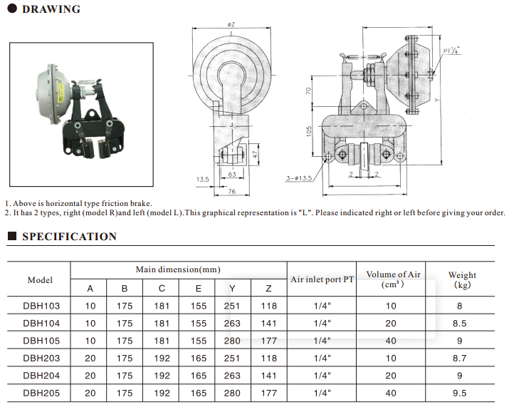 It is widely applied in working machinery, construction machinery, steel rolling machinery, stretch-wire machinery, stranding machinery, winding machinery, gantry crane, paper making machinery, ship, trimming shears machinery, unwind machinery, orientation machinery, tension controller and etc. This brake is horizontal type, there are 4#、5# air head, left and right mode. DBH mode air brake model: DBH-104/105 DBH-204/205 DBH-385.