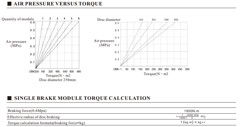 DBK model air caliper disc brake adjustment torque in large range via air pressure, it is suitable for urgent brake and tension control. Manual brake can keep long time braking through pressing springs for a ling time, torque is from 2-36500N.m.