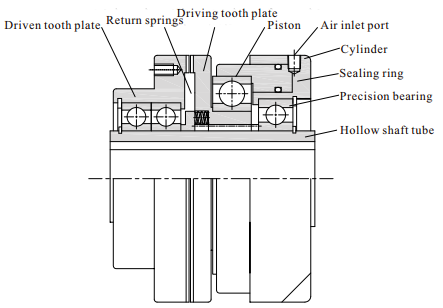 1) After supplying air pressure, driving tooth plate and driven tooth plate integrated with axial movement; after exhausting air pressure, driving tooth plate and driven tooth plate are separated by return springs.