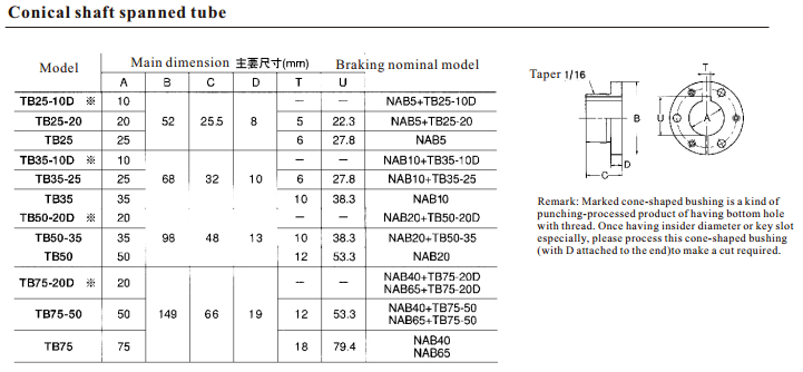 NAB model brake installs conical shaft spanned tube onto shaft in following order: