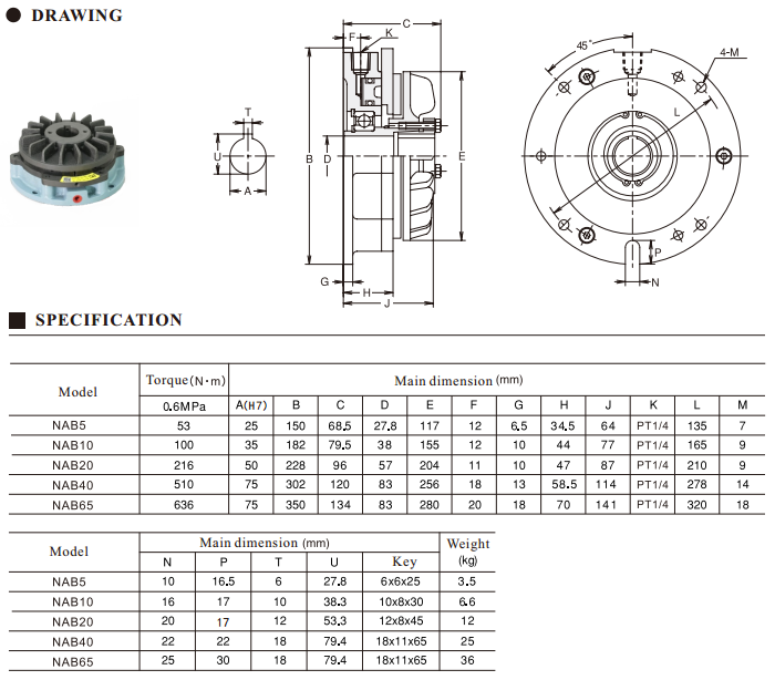 NAB model brake relies on air pressure to brake, return springs to release. After supplying air pressure, piston pushes piston aircraft and friction plate move towards to and compressed shaft attached lining disc, disc and other rotating parts stopped, brake braked. After exhausting air pressure, piston aircraft and friction plate are separated with shaft attached lining disc by return springs, brake released. It reduced heat generated from friction by cooling plate mounted on disc with hub. Friction plate is two-cut style, using screwdriver to take out head inside screw through hole of disc with hub, in order to replace friction plate.